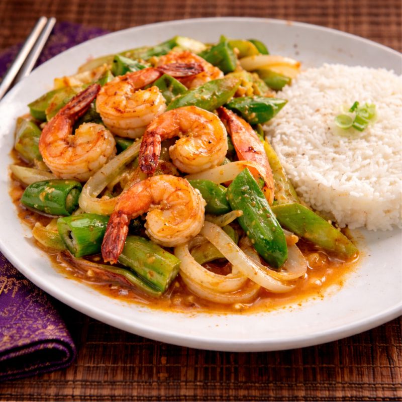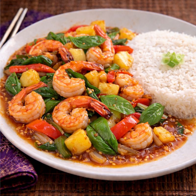 Crevettes sautées, poivrons verts et rouges, ananas, feuilles de basilic, sauce thaïlandaise pimentée Sautéed shrimp, green peppers, pineapple and fresh basil leaves with a thai chilli sauce