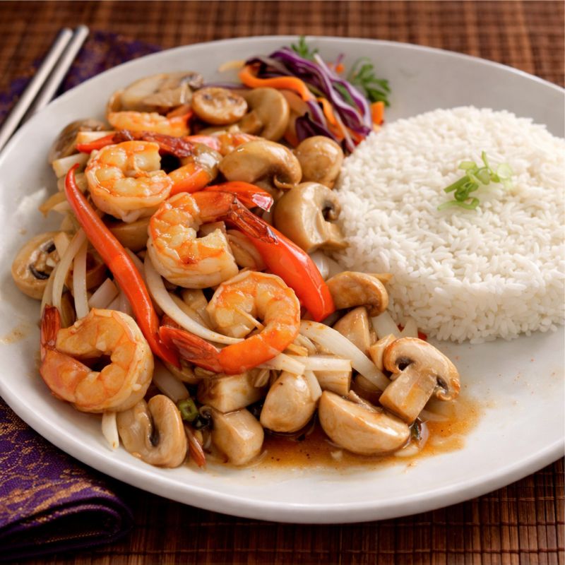 Crevettes sautées, champignons, oignons, poivrons rouges, poivre moulu Sautéed shrimp, onions, red peppers with fresh ground pepper