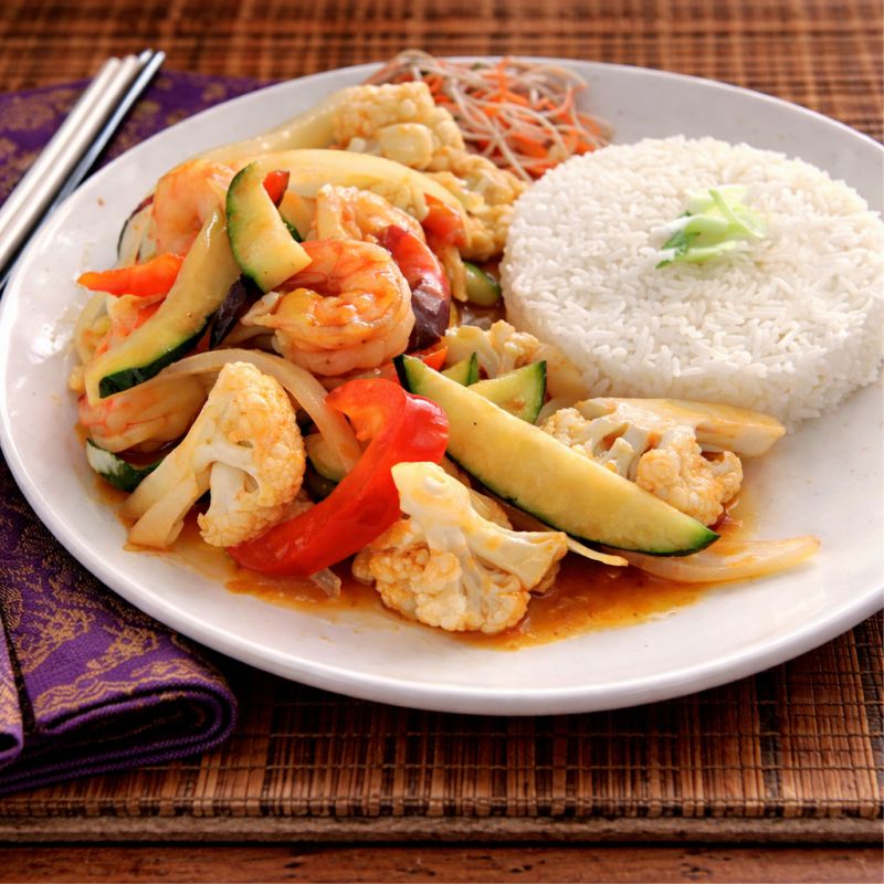 B) De Phuket 🧂🌶️ Crevettes sautées, chou-fleur, brocoli, zucchinis, poivrons rouges, poivre moulu et piment fort Sautéed shrimp, cauliflower, broccoli, zucchini, red peppers, ground pepper and hot chili peppers