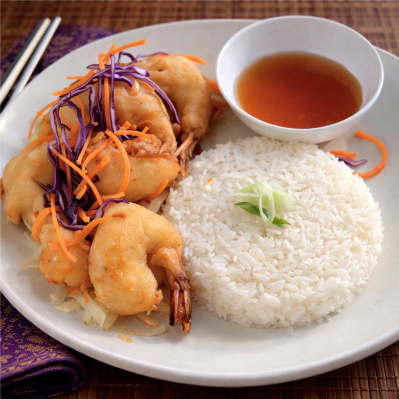 E) Les demoiselles du Mékong Crevettes panées, sauce aigre-douce Breaded shrimp with a sweet and sour sauce