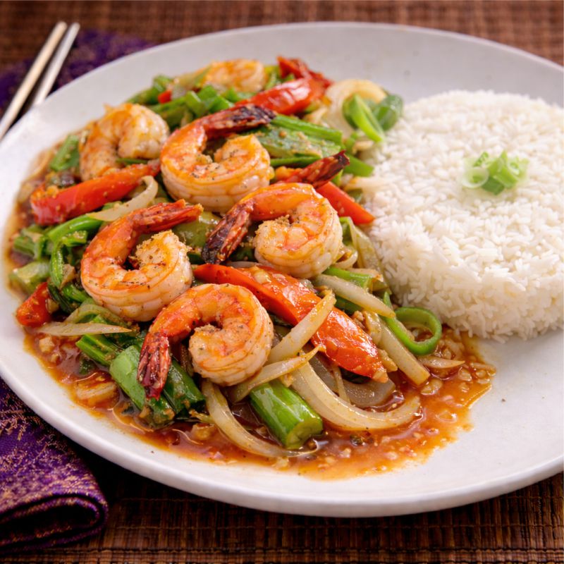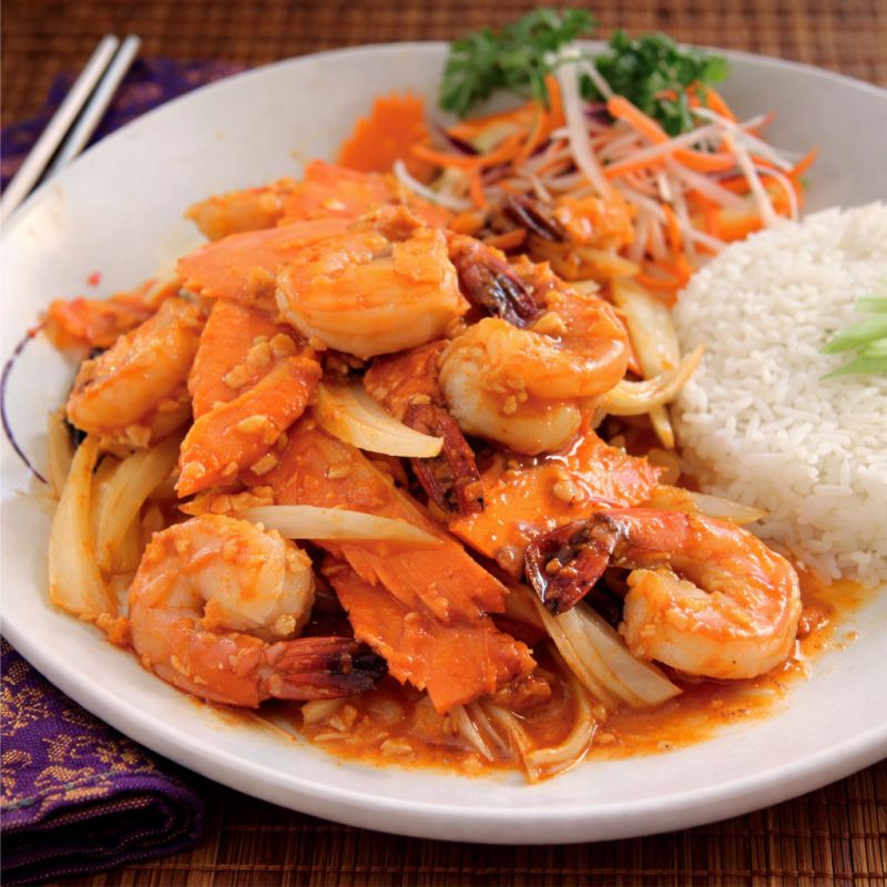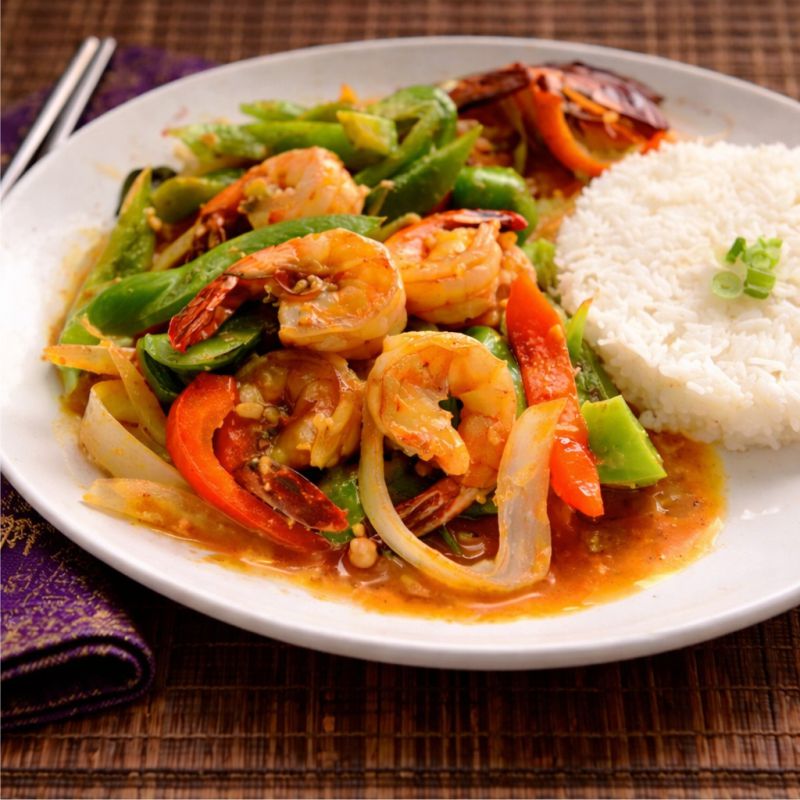 Malacca Crevettes sautées, poivrons verts et rouges, oignons, sauce asiatique parfumée Sautéed shrimp, green and red peppers, onion with an asian style sauce