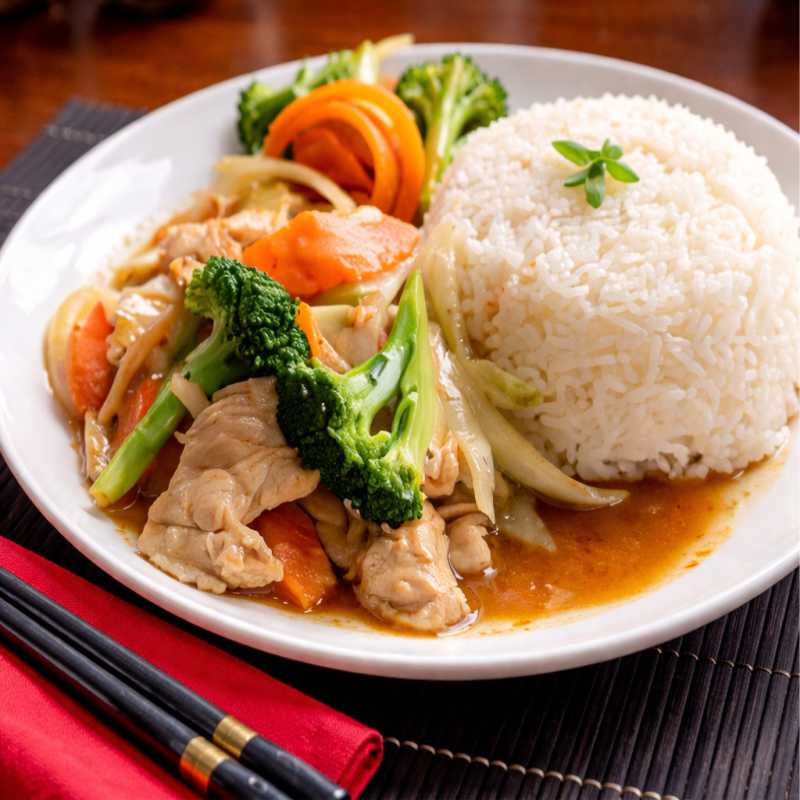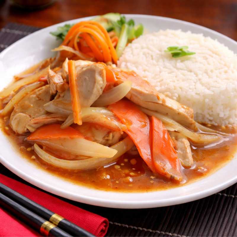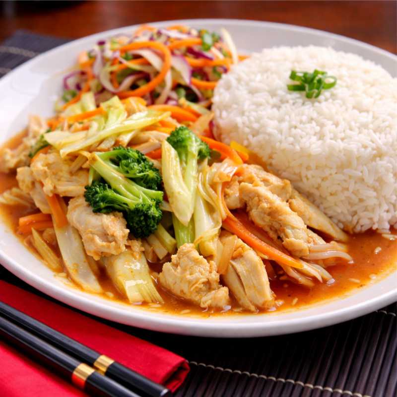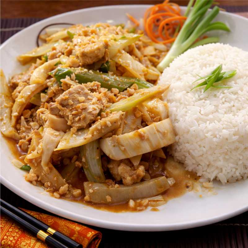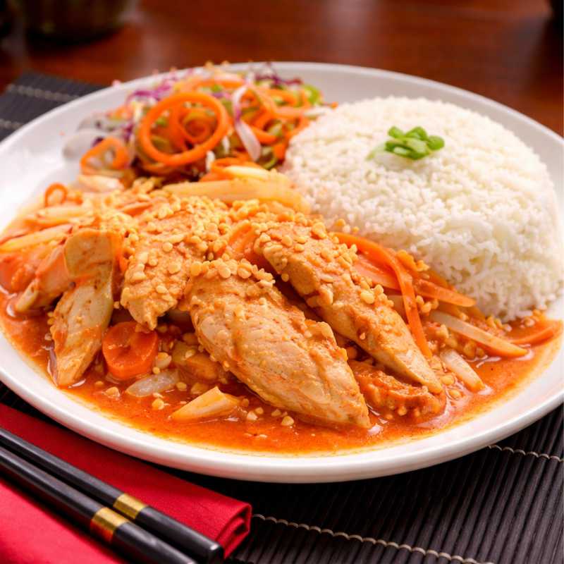Grain-fed chicken sautéed in red curry with coconut milk, lemongrass, carrots and onions, topped with ground peanuts.