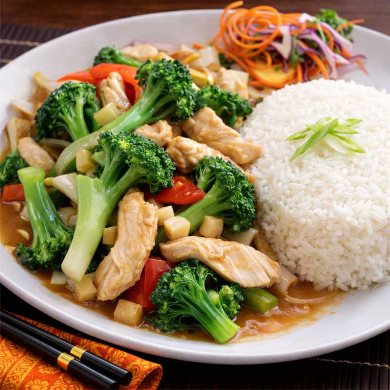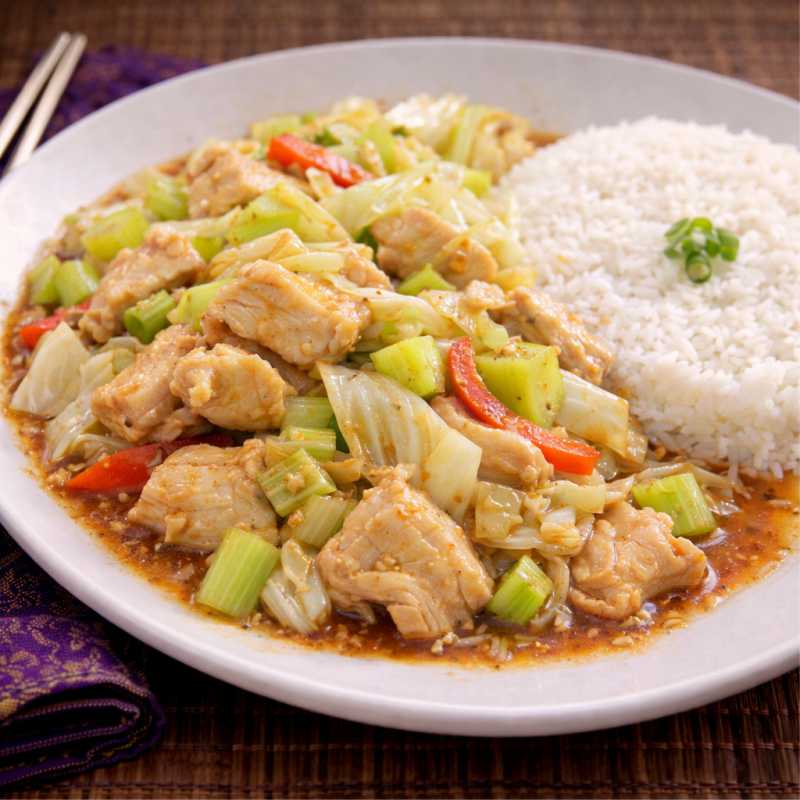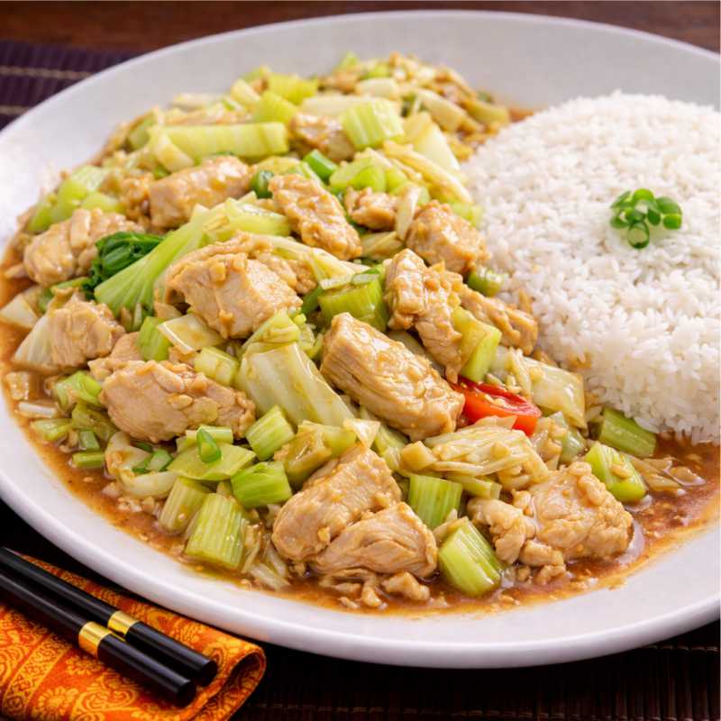 Free-range chicken stir fry, sweet green and Chinese cabbage and celery