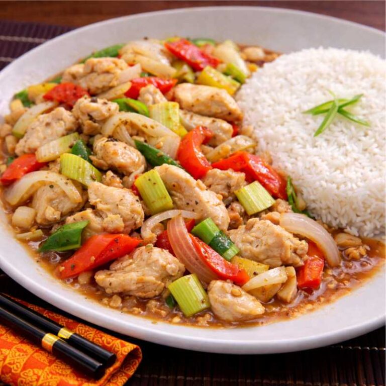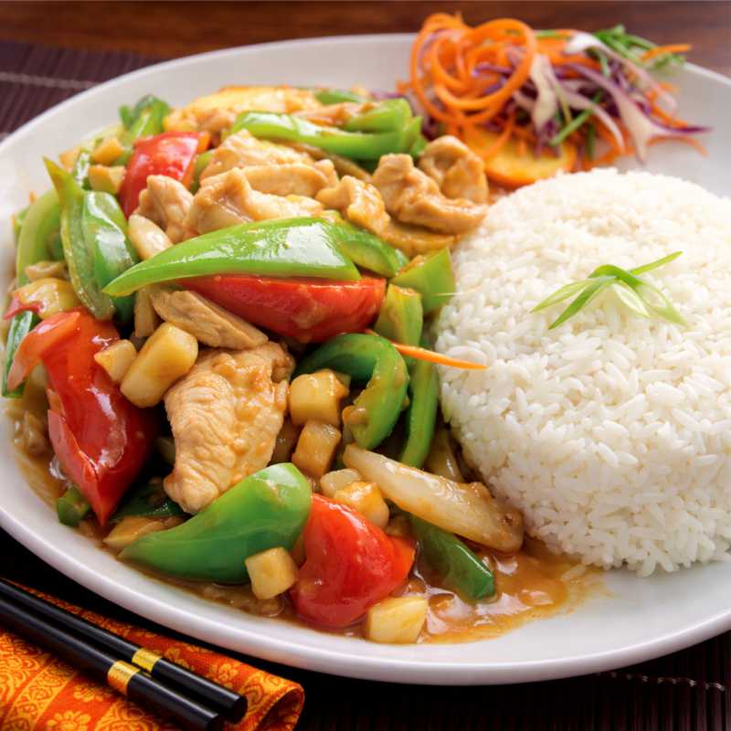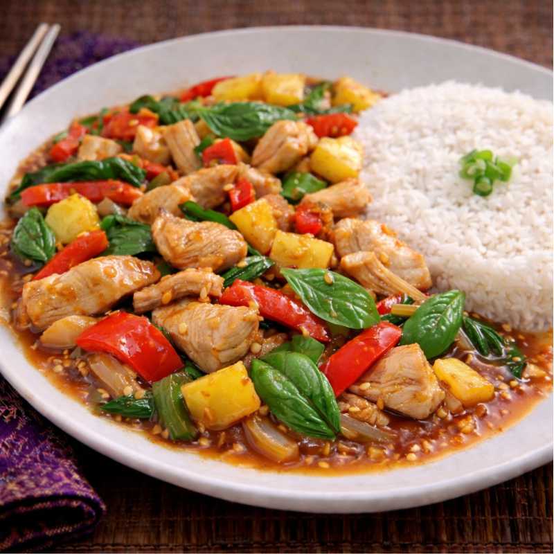 Poulet de grain sauté, poivrons verts et rouges, oignons, ananas, sauce piment fort, feuilles de basilic