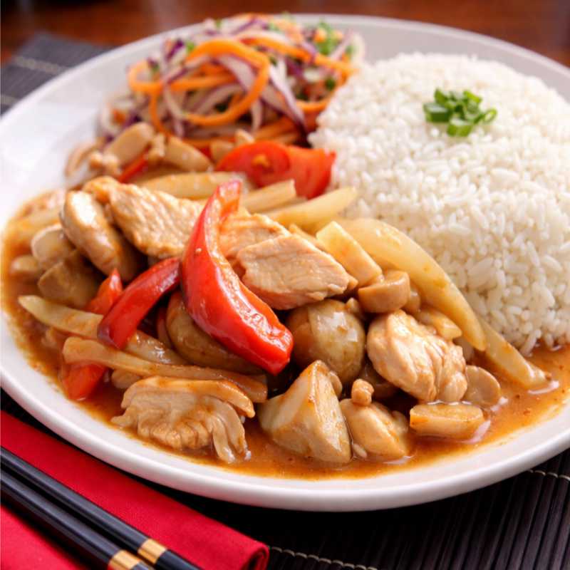 Poulet de grain sauté au cari rouge, lait de coco, citronnelle, carottes et oignons, arachides moulues.